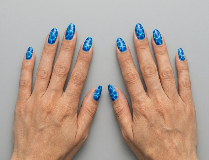 Water marble nails are the most eye-catching trend of Summer 2026, deep blue rippling patterns that make your nails look literally like the ocean. To get them, nail artists drop different shades of polish into water, swirl them together, and dip the nail in. The result is unique every single time. Leave this one to the professionals, but definitely ask for it at your next appointment.