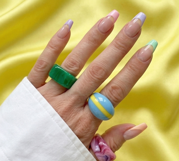 But if you want to stay ahead this spring, pastel French nails are the move. Same structure, softer palette—think lilac, mint, baby pink, and lemon yellow, sometimes all on the same hand. It feels lighter, more seasonal, and way more 2026. The blue is cool. The pastels are right now.