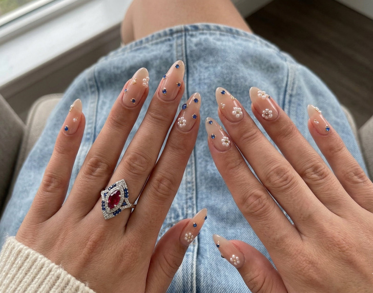 If there’s one thing blowing up at nail salons right now, it’s gems—small crystals and rhinestones placed directly on the nail. You don’t need much. One gem on each nail, or just a few clustered on one finger, is enough to transform a basic manicure completely.