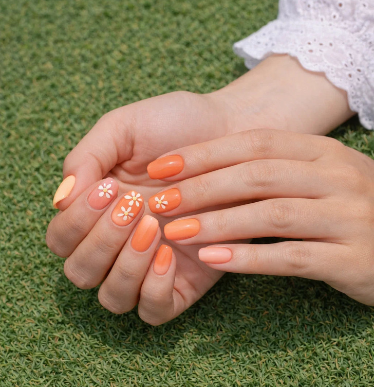 This is the manicure that just makes sense for spring. Short, rounded nails in a warm coral-orange with tiny daisy details. This kind of nail is everywhere right now, and for good reason. Micro floral nail art on short oval nails is one of the biggest trends of Spring 2026, small hand-painted flowers or stickers on a fresh, fruity base that feels seasonal and fun. Simple, wearable and genuinely on trend.
