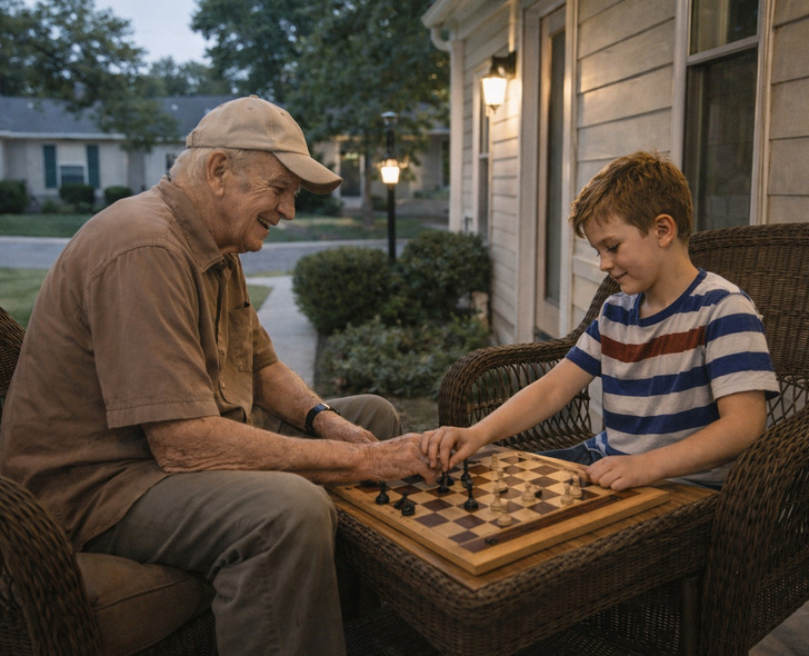 • My son asked why the old man next door sits on his porch every evening. I said, “He’s probably just relaxing.” My son said, “No. He’s waiting. Nobody ever comes.” Next day my son walked over with a chess board. He doesn’t know how to play chess. The old man taught him.
