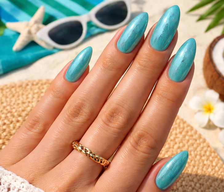Aqua shimmer nails add a luminous, ocean-inspired glow to summer nails, blending cool blue tones with a sparkling finish. This nail design works especially well with gel manicure styles, giving a glossy, light-catching effect that feels fresh and modern. Whether done in a salon or at home, aqua shimmer nail polish brings an instant vacation-ready mood to any beauty look. It’s a standout choice for anyone wanting a playful yet elegant seasonal update.