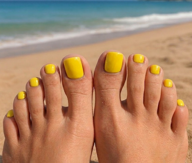 Bright lemon-yellow tones are gaining traction as a summer pedicure color trend, especially for their ability to create strong contrast against both light and tanned skin. The pigment sits in a warm, high-saturation range, which helps the color appear more vivid and noticeable in daylight compared to softer yellows.