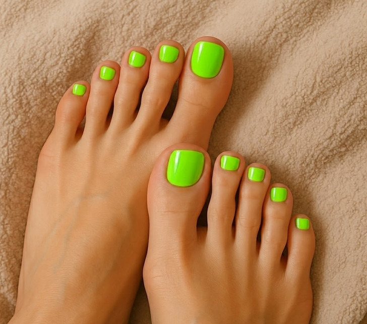 Tennis-ball green is emerging as a bold summer 2026 pedicure color, known for its high-visibility neon tone that instantly draws attention to the toes. Its yellow-based undertone makes the shade appear even brighter in natural light, which is why it’s especially popular for sunny, outdoor settings. This color is typically worn as a solid pedicure, allowing the intensity to stay consistent and create a strong, statement finish.