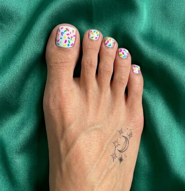 This playful pedicure uses a milky or white base with tiny multicolored dots that mimic the look of donut sprinkles. Because the color appears in small, separate accents rather than full coverage, the design feels lighter and more balanced on the toes. It’s a fun option for summer nail ideas, especially for anyone who wants a cute pedicure look that adds color without relying on a single bold shade.