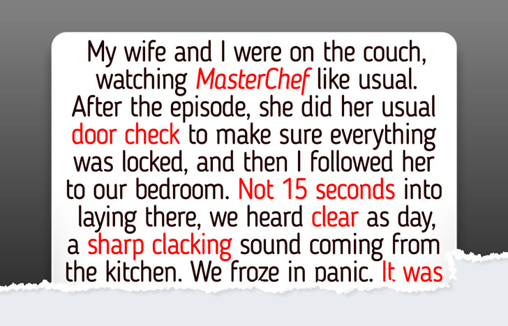 Not 15 seconds into laying there with her, we heard, absolutely clear as day, a sharp clacking sound coming from the kitchen. We froze in panic. It was LOUD. I could hear it with my bedroom door closed. It honestly sounded like something with some real weight was walking around my kitchen.