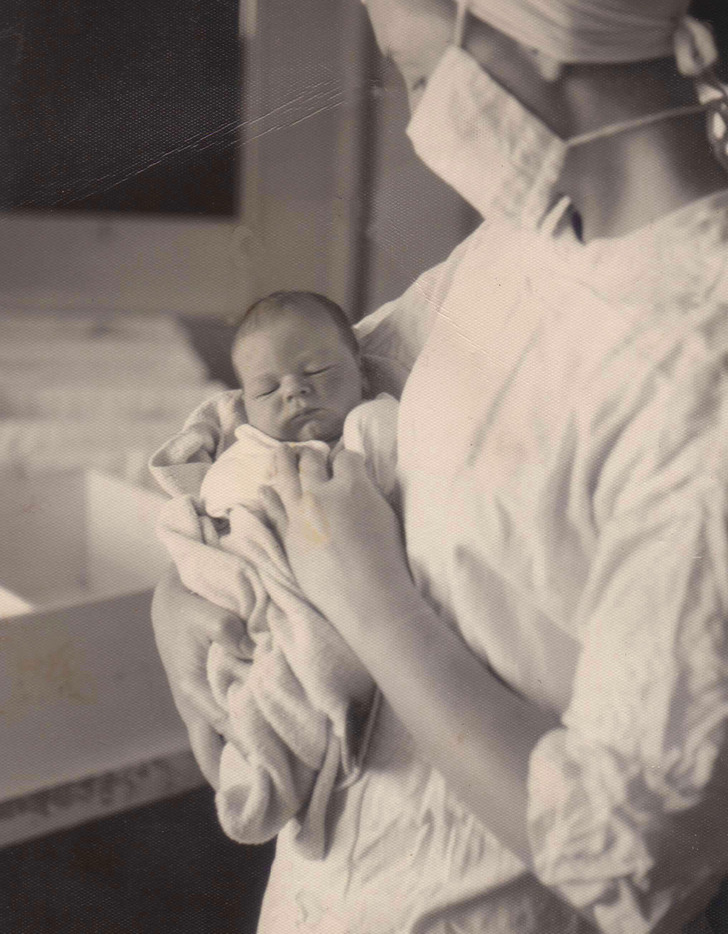 9. “The sweet nurse holding me after my birth, 1953.”