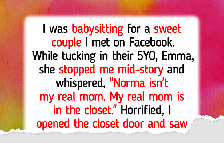 • I was babysitting for a sweet couple, Norma and Ethan, whom I’d met on Facebook. While tucking in their 5-year-old daughter, Emma, she suddenly whispered, “Norma isn’t my real mom. My real mom is in the closet.”