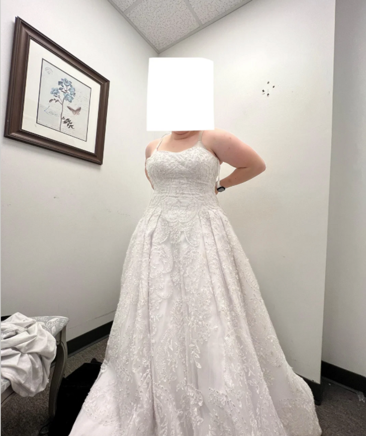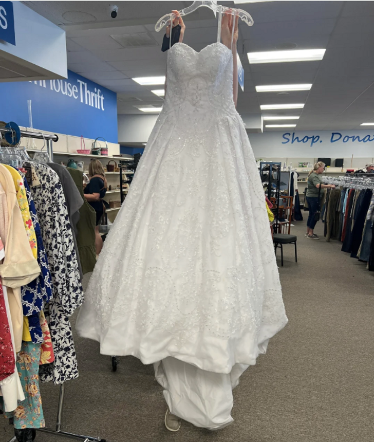 “I just thrifted this gorgeous dress. $35. My sister found it online at a bridal store. Brand new it costs $3500.”