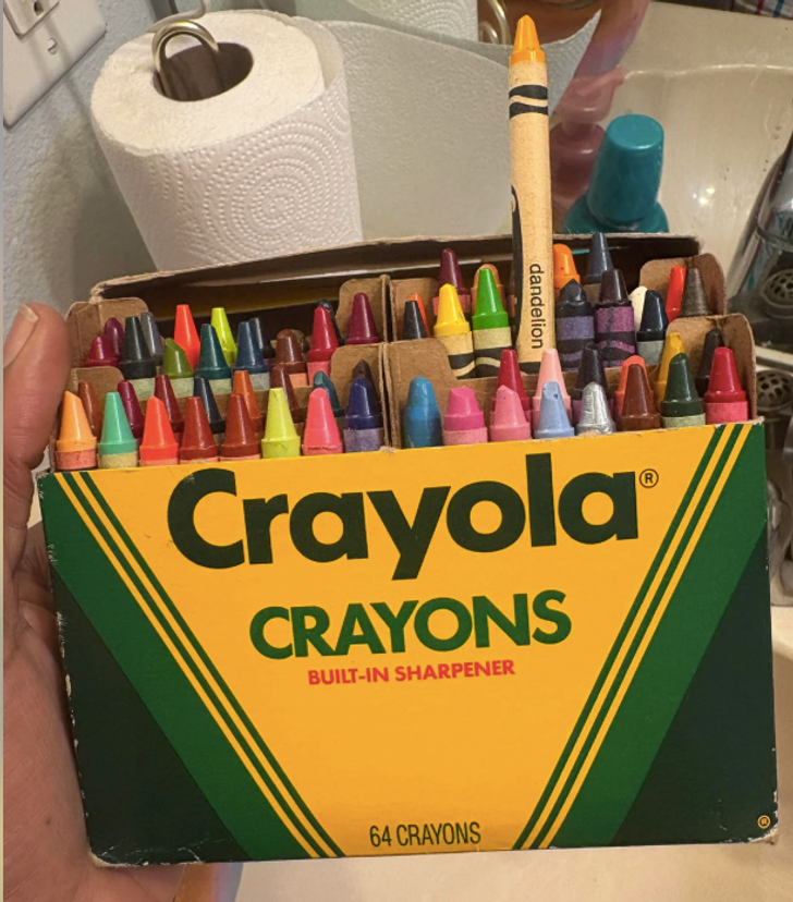 “Thrifted a 64 color box with a sharpener on the back to appease my younger self and was delighted to find an OG Dandelion crayon inside.”