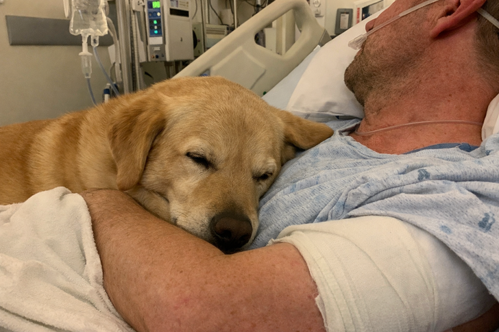 My husband had curled his entire body around the dog in a corner, taking the extreme heat of the falling debris. When the dog finally realized my husband was alive in the hospital, he refused to leave the bedside, resting his chin on the one part of my husband’s arm that wasn’t bandaged.