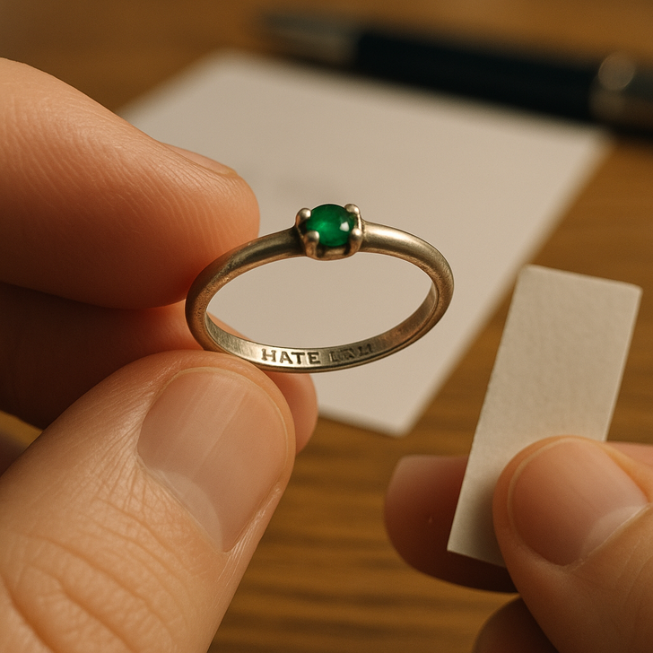 As I tilted it under the light, something caught my eye along the narrow inner edge of the band—tiny markings I’d never noticed before. I rotated the ring, squinting, and realized it wasn’t just wear or scratches. It was a line of engraving, so small it was practically invisible unless the setting moved just enough to reveal it.