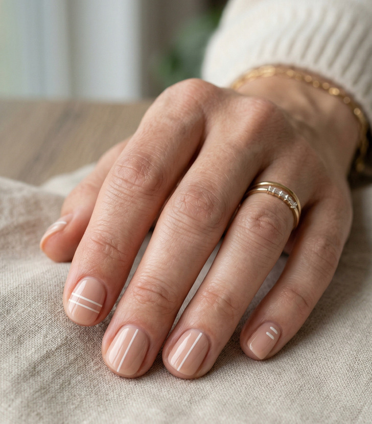 Minimal white line nails are the definition of quiet luxury this season. Clean, delicate strokes over sheer or nude base create a look that’s effortlessly modern and refined.