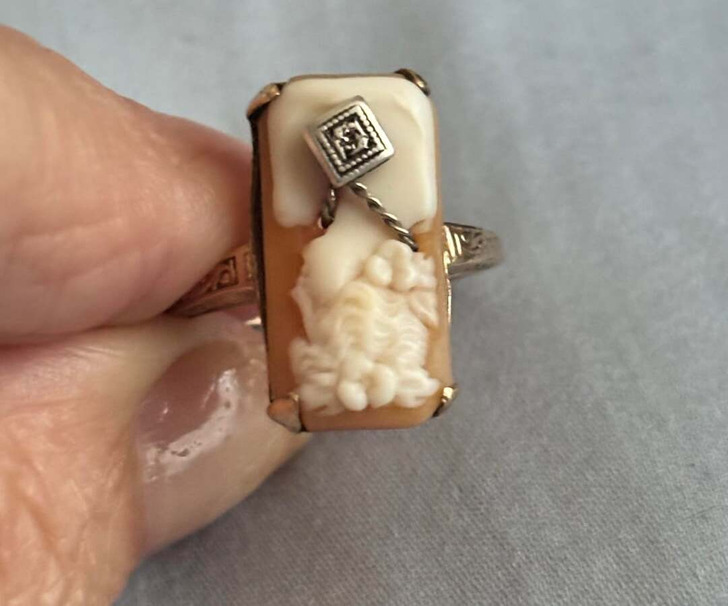 Answer: Not sure if you’re aware, but you’re holding it upside down. It’s a carved cameo style ring with a lady wearing a necklace.