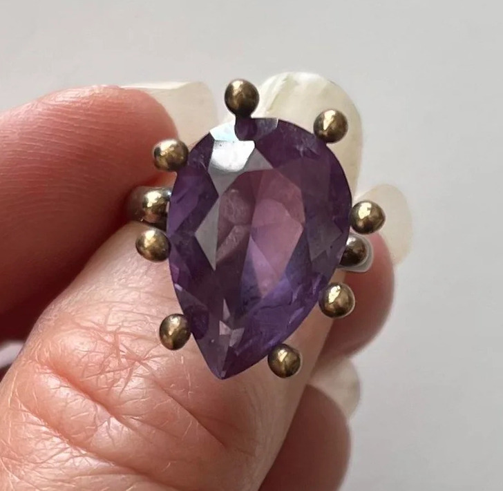 2. “Donated to a thrift store where I sort all the jewelry. It’s one of the more unique rings I’ve come across. I assume it’s amethyst set in 14k.”