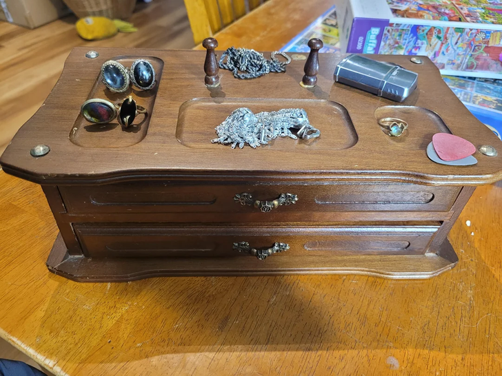 1. “Thrifted this jewelry box today because I could hear things hidden inside of it. These treasures were hidden inside!”