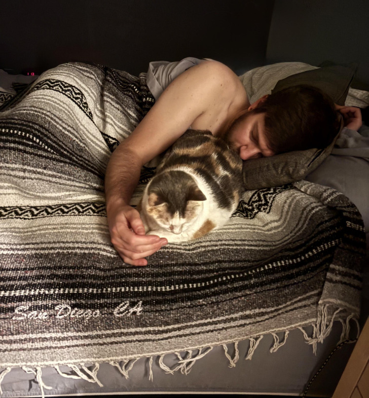 My husband with the cat last night. He took up the whole bed, but I didn’t have the heart to wake him.