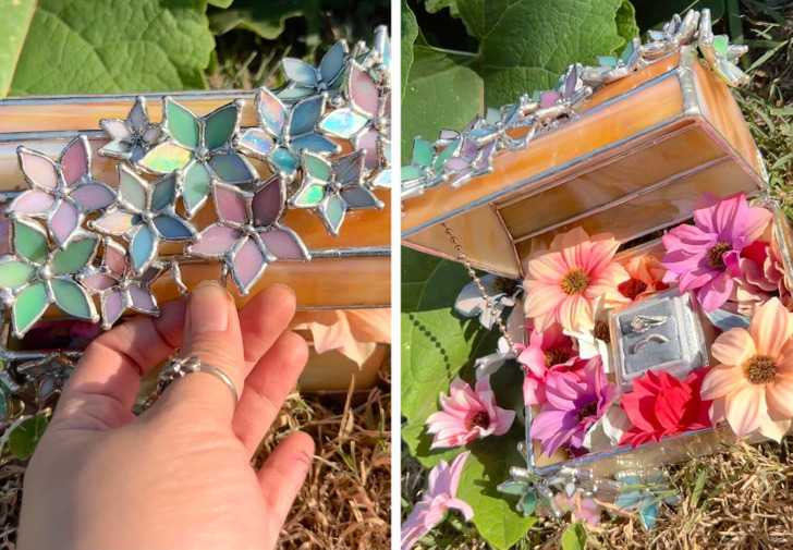 Open for a surprise! It’s a stained-glass engagement ring treasure chest!