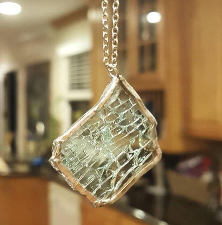 My sister was recently in a car accident (she’s okay). I saved the shards from the windshield to make pendants.