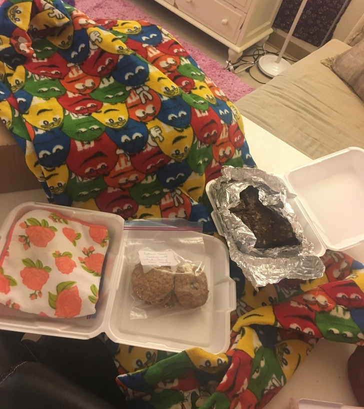 Forgot a blanket at Grandma’s (she’s 90!), asked her to send it to me. She did, but she wrapped homemade cookies and brownies inside.