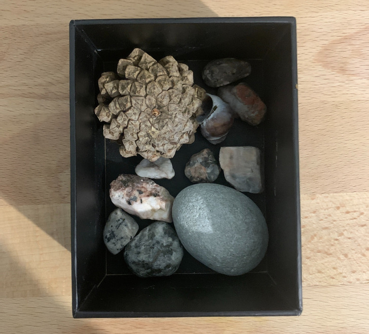 I have a box of stones that my wife gave me. As we walk through the forest, she spots an interesting cone or stone and hands it to me.