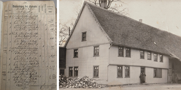 The first image is a record from insurance documents from 1753, when the owner was my great⁷-grandfather. In the picture from the house, you can see my great-great-grandparents in 1910.