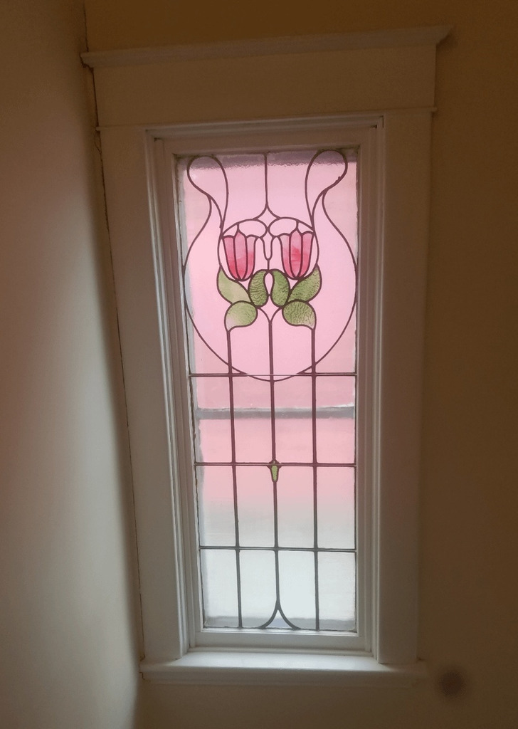 I live in a house from 1912. And this stained glass window is right above our staircase.