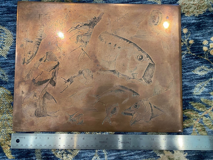 I got this copper plate with engravings of various fish, snails, and crayfish from my great-aunt.