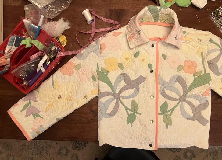This week has been a week of improving my basic sewing skills through making quilt clothing from thrift store quilts. Made this jacket for a friend last night.