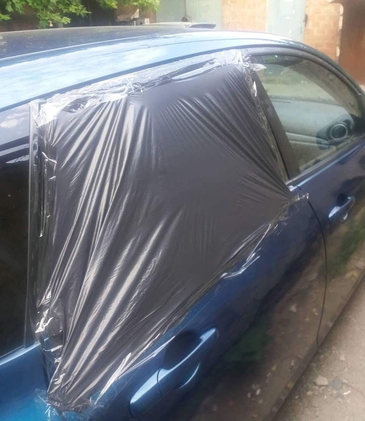My sister left her car window down on a rainy day, and someone did this.