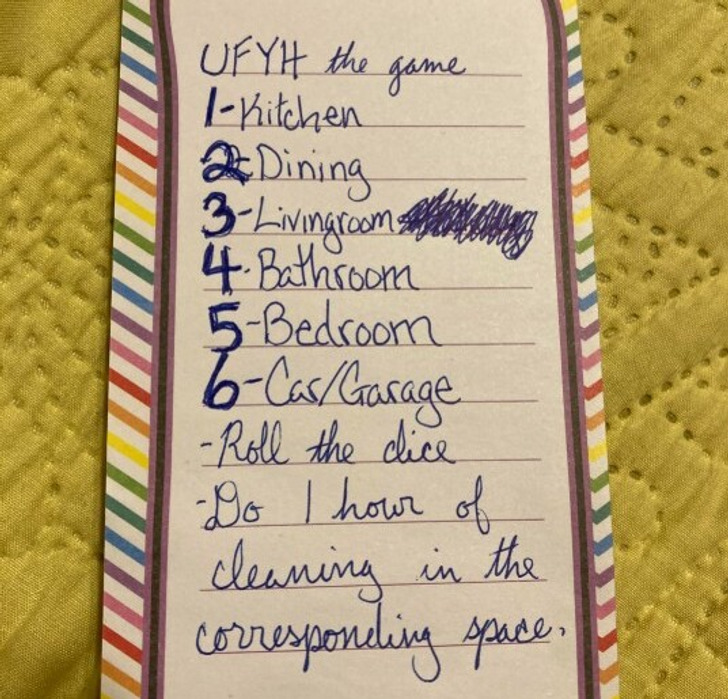 “I always struggle to choose where to start cleaning. I decided to roll a die, detailing which number corresponds to each room.”