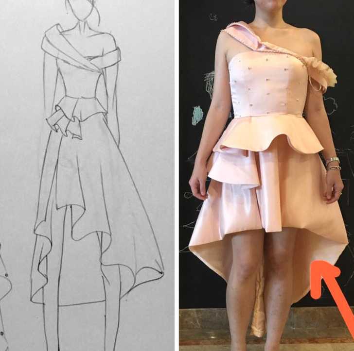 “The designer’s drawing of my bridesmaid dress vs what she made.”