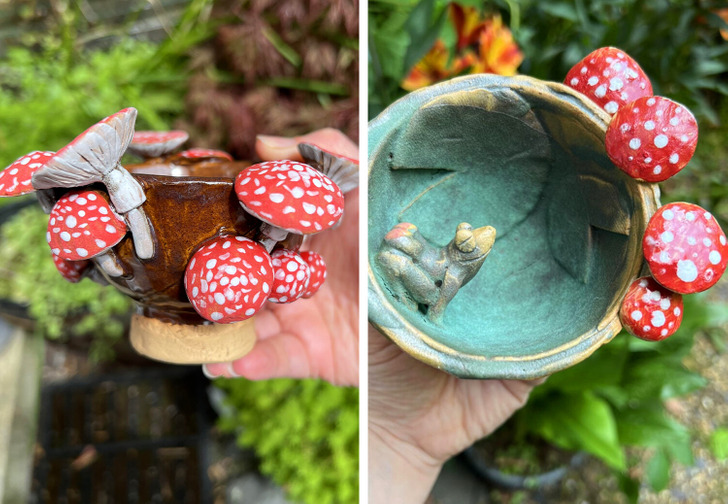 I make bowls with frogs and mushrooms for friends.