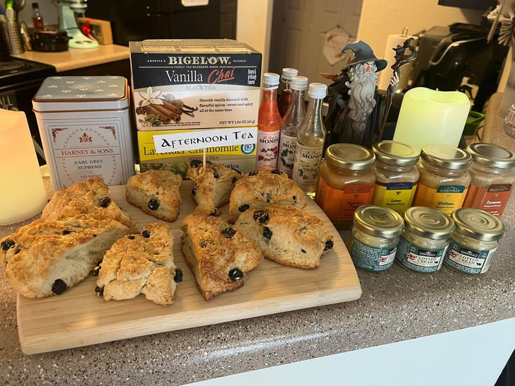 Breakfast — eggs, bacon, tomatoes, hashbrowns. Second Breakfast — waffles with berries and cinnamon sugar butter. Elevenses — caprese, Lembas bread. Luncheon — meat, cheese, more Lembas bread. Afternoon Tea — teas, blueberry scones, clotted cream, and a honey flight. Dinner — potato cream cheese soup. Supper — rosemary steak, potato, and carrot pasty with red wine gravy and mustard cream. Dessert — Farmer Maggot’s carrot cake.