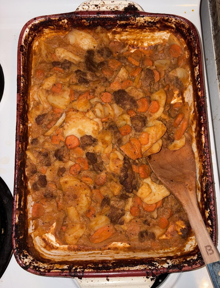 I spent over 2 hours on this casserole and asked my husband to put it away while I put the kids to bed. This morning I found this. It was still on the stove.