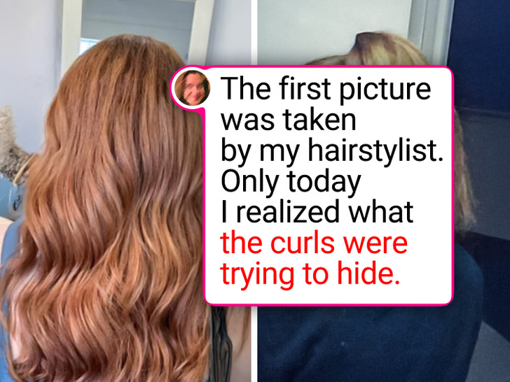 “The first picture was taken by my hairstylist to showcase my new hair cut and color. The second picture is the photo I took today, when I realized what the curls were trying to hide.”