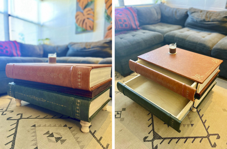 Tried to find a ready-made coffee table in the shape of books, but couldn’t. Had to make it myself.