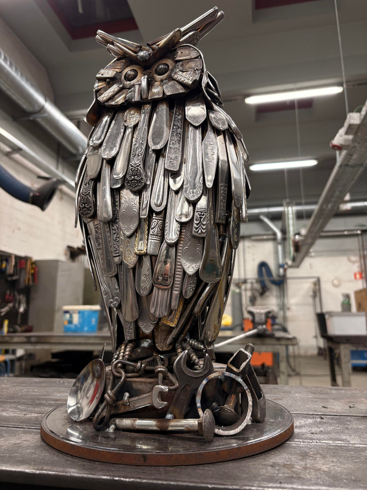 This owl is made from materials found in the workshop: cutlery and auto parts.