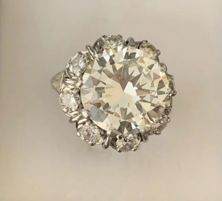 Mom’s little secret. A 6-carat diamond, surrounded by 8 more diamonds at 0.5 carats. Platinum setting. Approximately 1970.