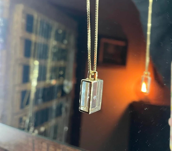 The pendant is at least 30 years old. Inside is a floating diamond. Such a cool inheritance from Grandma.