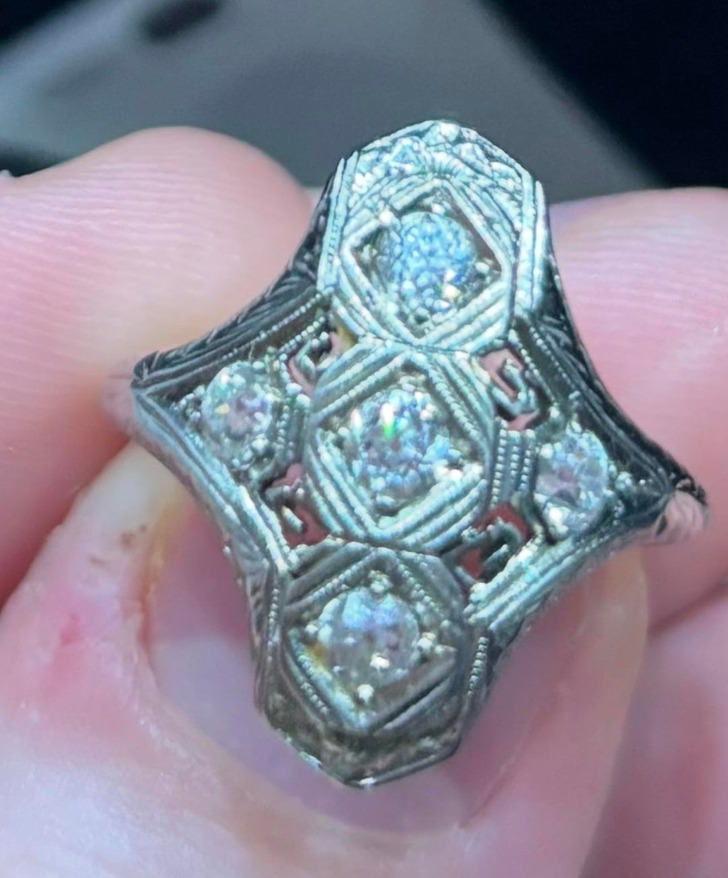 I got this ring from my great-great-grandmother. Honestly, I’m not sure about anything, even thinking of taking it to an appraiser. But it seems like it’s diamonds and white gold.