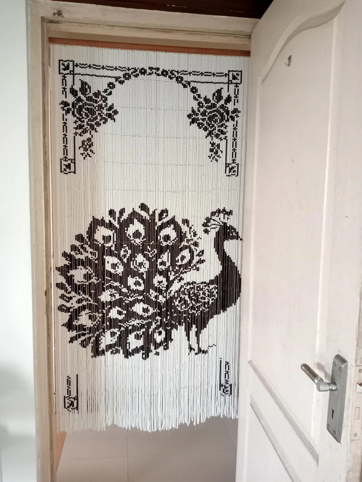 Not my original idea. I was inspired to recreate the vintage Chinese glass bead curtains. They are colorful. However, mine is in black and white. I couldn’t get many color beads options, hence I went with what I had.