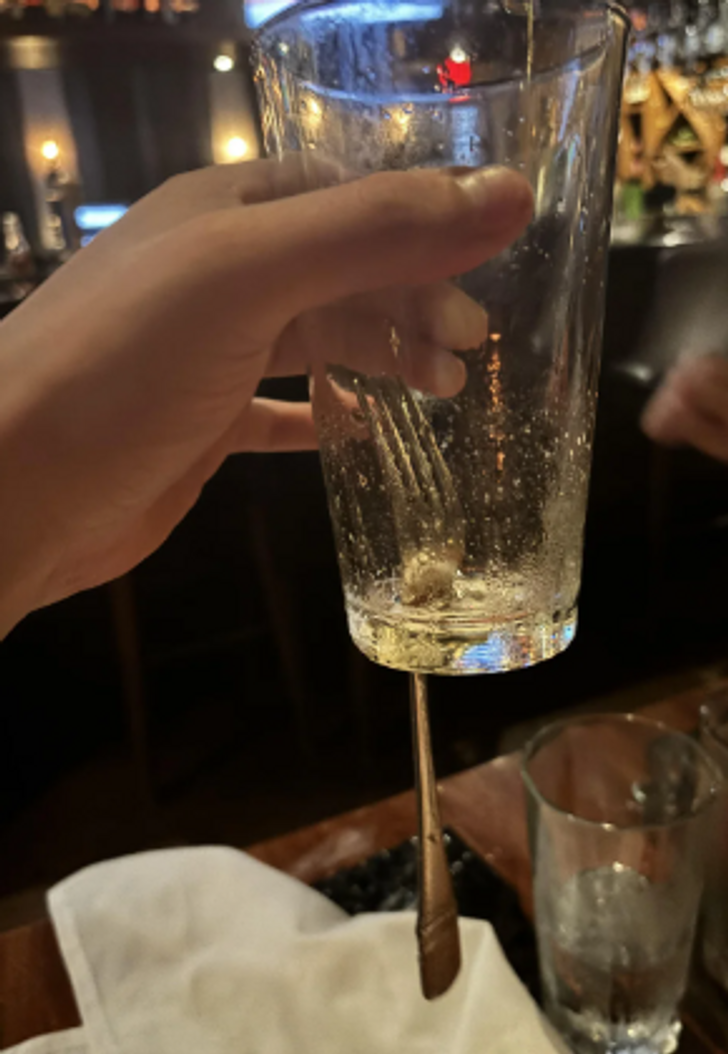 “The waiter dropped a fork into my glass, and it created a perfect hole without shattering the glass.”