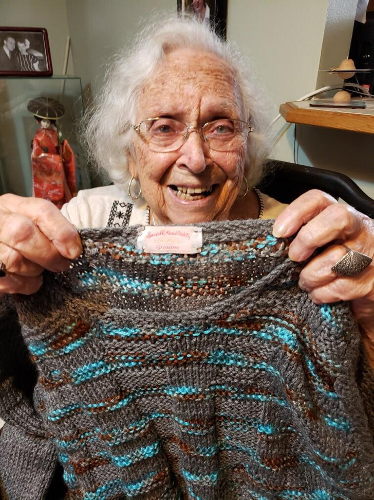 My grandma is 91. Just look at the sweater she knitted for me!