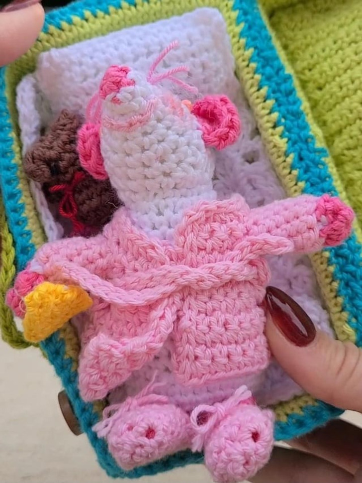 My little sister loves rats but is allergic, so my grandma crocheted her a rat in a suitcase complete with a pillow, teddy bear, and dresses she can change.