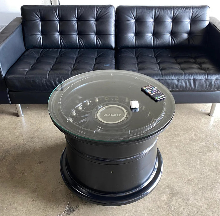 6. “A commercial airplane wheel was transformed into a 275-pound rotating coffee table.”