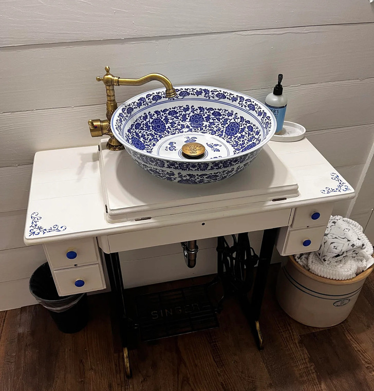 2. “My parents rebuilt my grandfather’s crumbling, 100-year-old childhood home. At the start of the project, they found an equally old Singer sewing machine tucked away in the junk and rubble, and they turned it into a sink/vanity unit.”