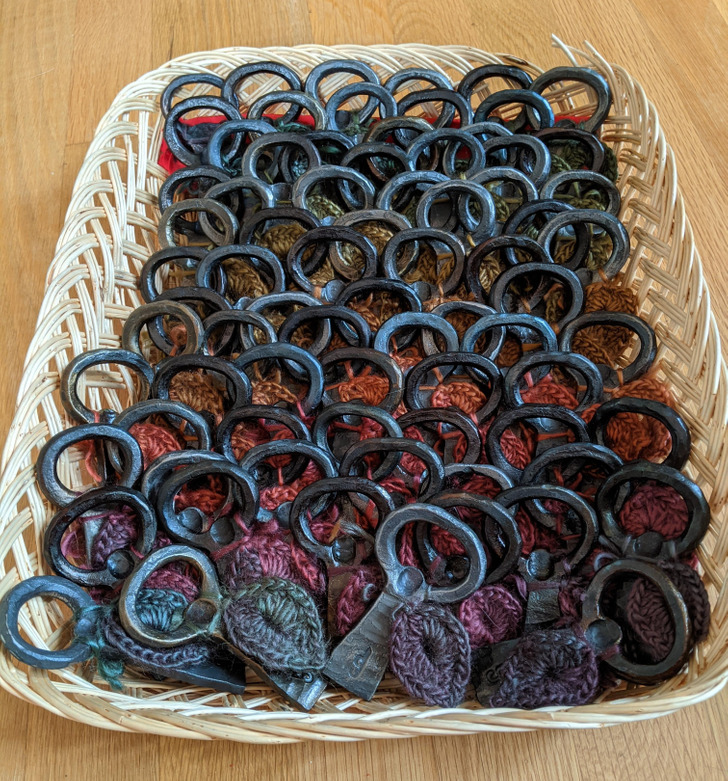 My wife and I made 76 wedding souvenirs. I forged bottle openers, and my wife crocheted leaves to go with them.