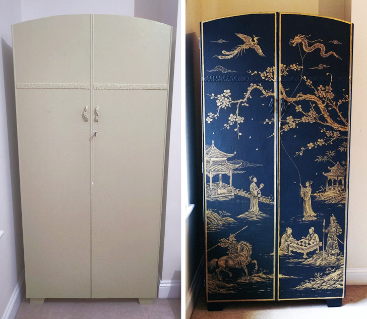 Just finished painting a wardrobe in the Chinoiserie style. Before and after.