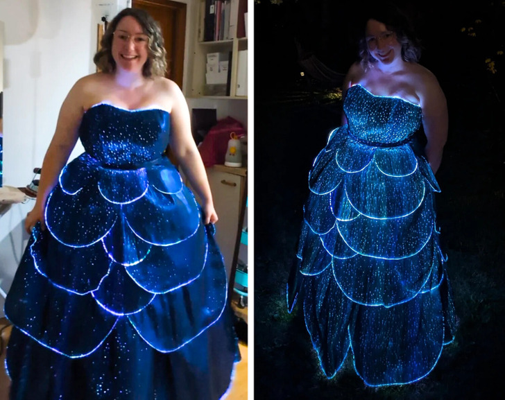I made a dress from fiber optic fabric, and now I can control it with my phone: lighting is adjustable.